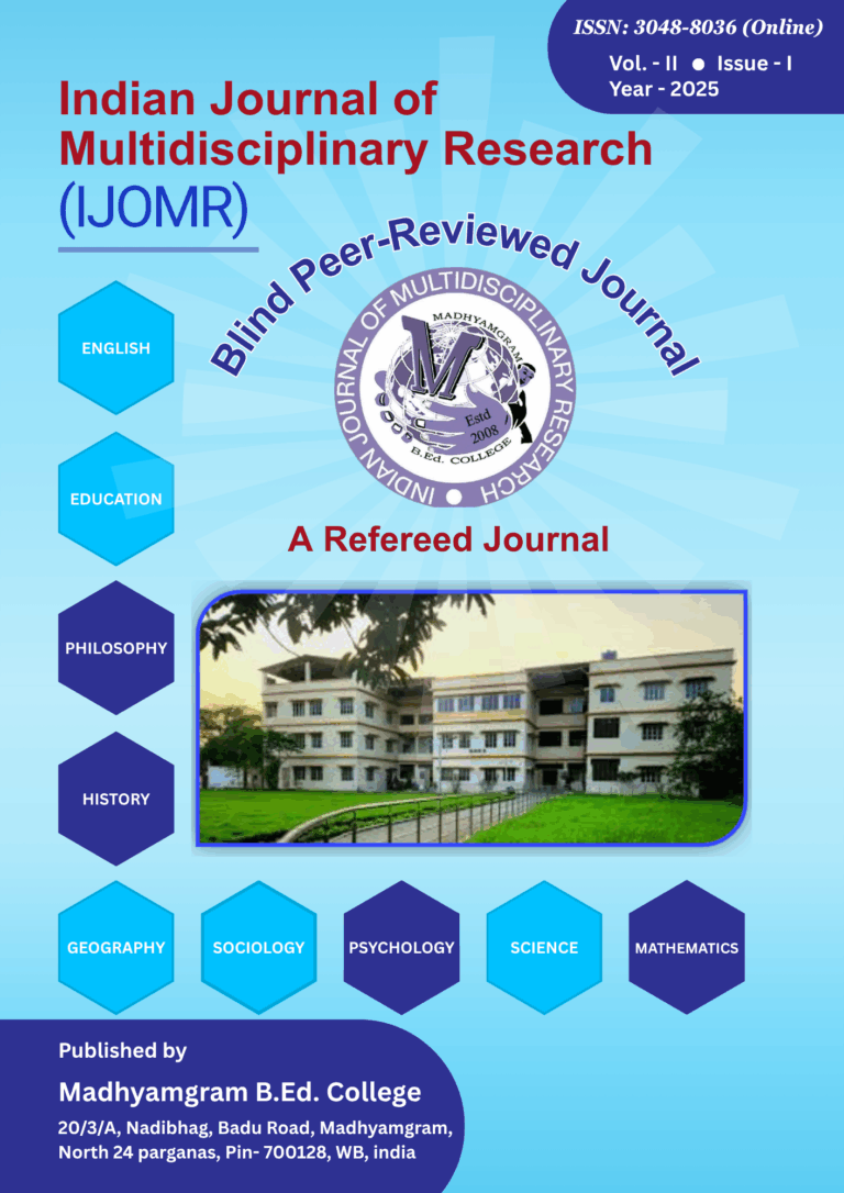Indian Journal of Multidisciplinary Research (IJOMR) is an online, national, blind peer reviewed, multidisciplinary journal published yearly in English by Madhyamgram B.Ed. College, Kolkata. It aims to provide on online platform to promote excellence and advancement in different research fields like English, Education, Philosophy, Sociology, Geography, Psychology, History, Science, Mathematics etc. All research articles submitted to the journal will be blind peer reviewed by the members of the editorial board that includes professionals from different universities, colleges and academic research institutes.